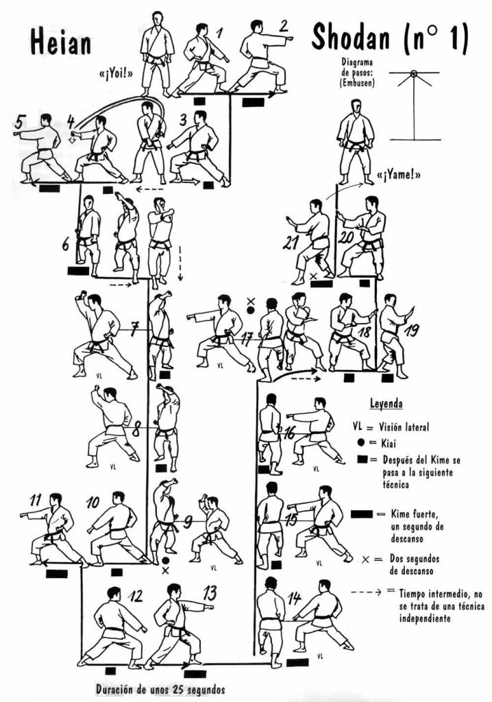 Es el primero de la serie de los Heians y el más básico en si, ya que solo se utilizan seis técnicas en su ejecución. Los desplazamientos utilizados son Zenkutsu Datchi y Kokutsu Dachi.