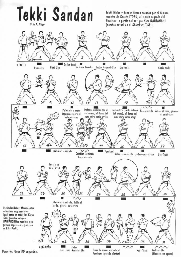 Tekki Nidan y Tekki Sandan son creación del maestro Itosu del Shuri-Te, tomando como referencia Tekki Shodan. En apariencia, las técnicas realizadas son sencillas; sin embargo, Nidan y Sandan son especialmente difíciles, soliendo practicarse desde 1er o 2º Dan.