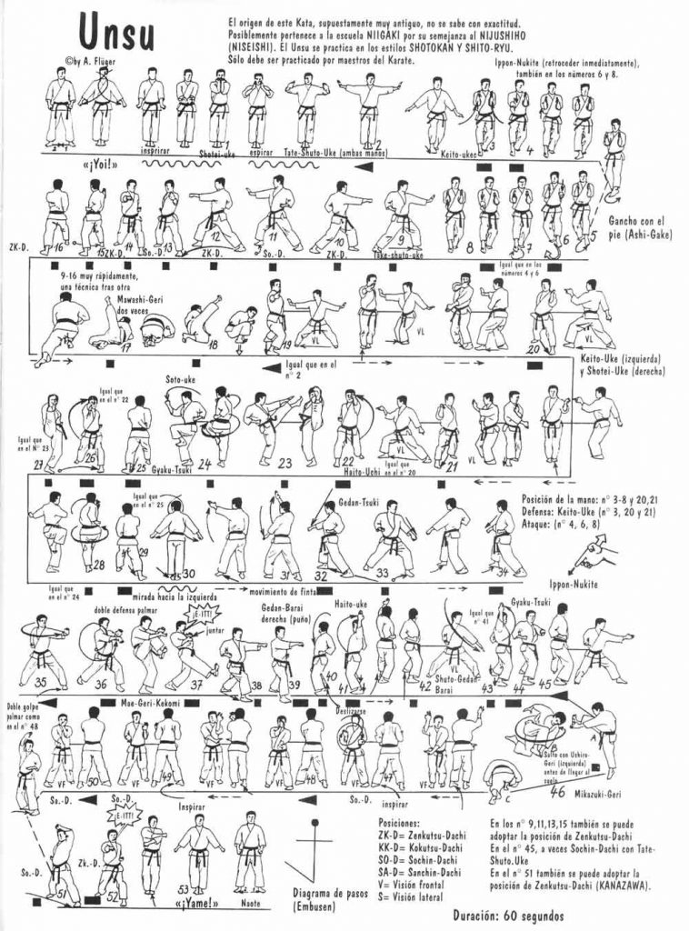 Es unos de los katas más avanzado en los estilos Shotokan, Shito-Ryu y otros. Generalmente se enseña al karateka de 2º a 4 º Dan. Es un kata que requiere unas buenas cualidades atléticas. Contiene muchas técnicas de mano, tales como el ippon-nukite en la secuencia de apertura. Unsu también contiene un giro de 360 grados de doble patada en salto con caída, aterrizando en el suelo boca abajo. Debido a esto, es un kata muy común en los torneos. Pues bien ejecutado resulta impresionante y muy vistoso.